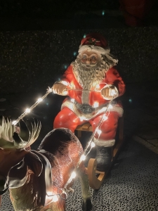 Die Rentiere mit Schlitten beleuchtet und der Weihnachtsmann sind auch Kunststein Naturkautschuk gefertigt.